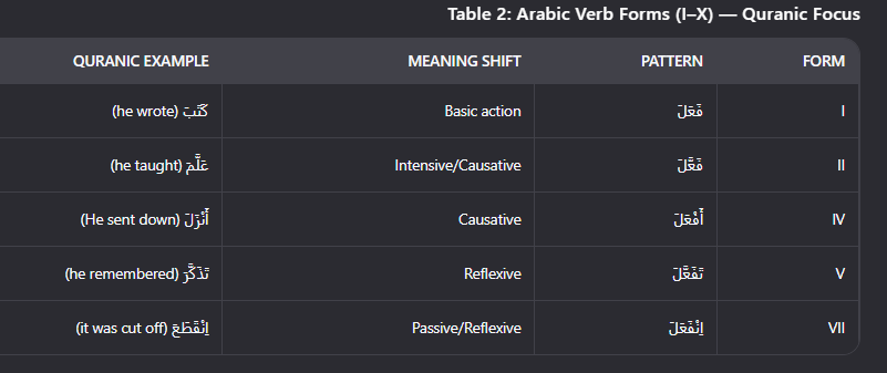 Most verbs follow 10 core patterns (awzan). Focus on the most Quranic: